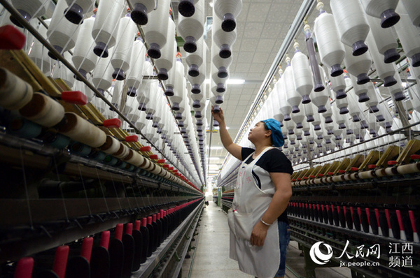 玉山县德隆纺织厂的工人正在作业线上作业。工信部发布的消息称,江西省2014年纺织行业出口保持快速增长,实际出口达59.39亿美元,出口额占全省的18.54%,较上年提高1.01个百分点。在劳动力成本高企、棉价差等不利的出口形势下,江西省纺织行业出口仍实现20.31%的增长,分别高于全国同行业和全省平均水平15.22、6.56个百分点,表现出较强的竞争力。