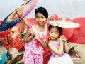 两个小美女手握油纸伞合影。