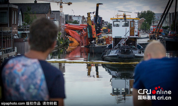 荷兰两部起重机发生翻倒事故 沿河房屋遭损毁(高清组图)