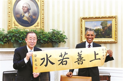 8月4日,联合国秘书长潘基文在华盛顿与美国总统奥巴马举行了会晤。当天恰逢奥巴马54岁生日,潘基文将自己的书法作品《上善若水》作为生日礼物赠予奥巴马。