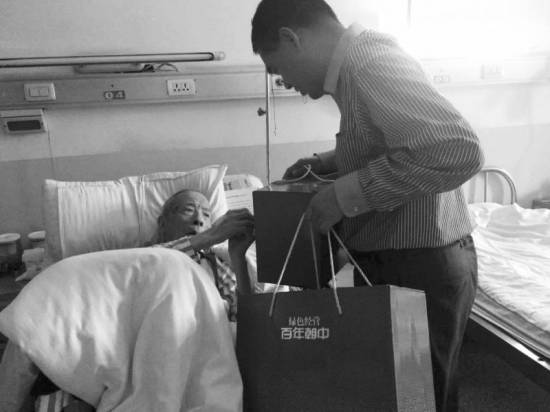 我国著名慈善家、中国浙商协会会长邵建波带着南京朝中食品公司董事长金炜提供的礼品,前往宁波医院看望90岁的抗战老兵赵永昌,并给老兵2000元慰问金。