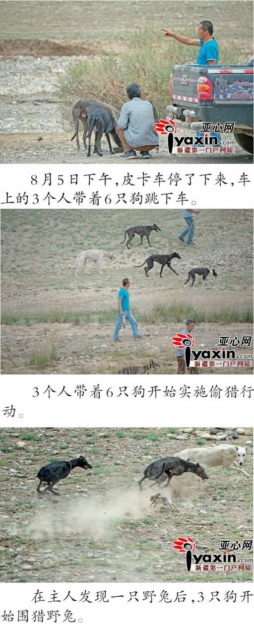 亚心网讯(记者马永平 图由网民提供)“兔子!上!”一声令下,1只黑狗箭一般地蹿了出去,其它5只也立即上前围堵,受惊的小灰兔拼命奔逃……8月5日下午,在昌吉市三工镇三工滩荒漠中,3个人带着6只细狗在疯狂捕捉野兔做体能训练,这一幕正巧被一群摄影爱好者记录下来。昨天,记者从昌吉州森林公安局得知,3名违法捕捉野生动物的嫌疑人已经被立案调查。