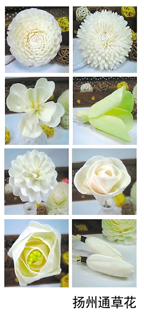 而扬州的通草花则完全是另外一种形式了。通草花的制作大致分为切片、裱草、剪花、捏花瓣、粘瓣、塑型、着色等几个步骤。首先将中药通草的内茎取出,截成段理直晒干,切成犹如纸片状的大片并裱平。通草切片后纹理细腻色泽洁白,可塑性极强。艺人用剪刀将通草片根据大小需要剪成花瓣的形状,每片花瓣用球棒依用力的轻重压出各种瓣型,所有花卉的叶片也均由通草剪切捏压而成。然后需要将大小花瓣叶子粘贴在由纸浆包裹塑造的植物枝干上,犹如超级写实雕塑一样塑造模仿出真花的形态,经由着色后的成品通草花其乱真程度几乎令人匪夷所思。通草花有牡丹、杜鹃、春桃、菊花、腊梅、月季等几十个品种。![]()