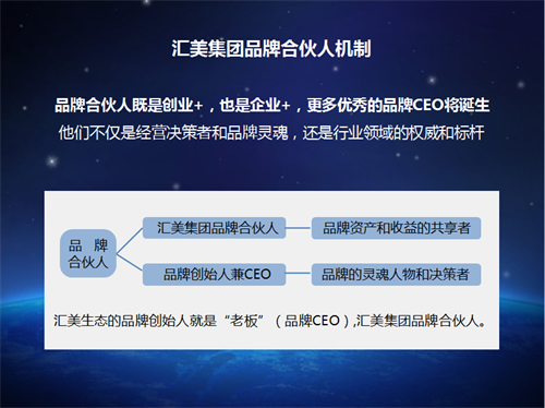 方建华表示,汇美生态的品牌创始人就是“老板”,品牌的CEO。而他作为集团创始人则是汇美生态规划的首席架构师、品牌决策和战略参谋顾问。成为真正意义上位居二线的导师,从以前拉着团队前进,转变为在二线谋划和主导商业模式变革。他的使命就是“成就更多的卓越品牌创始人和集团品牌合伙人”。汇美生态系统里面,“品牌合伙人”既是创业+,也是企业+,这里将诞生很多优秀的CEO,他们不仅是经营决策者和品牌灵魂,同时还是行业领域的权威和标杆。