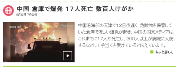 中国北部港口城市天津发生大规模爆炸,造成至少17人死亡百余人受伤。据官方媒体报道,爆炸发生地为该城市一处存放“危险化学品”的仓库。