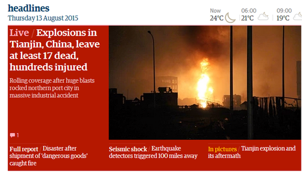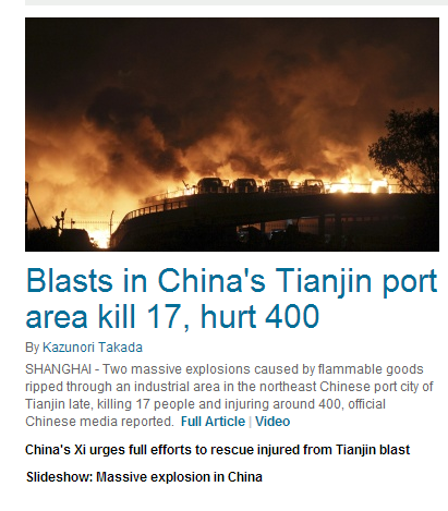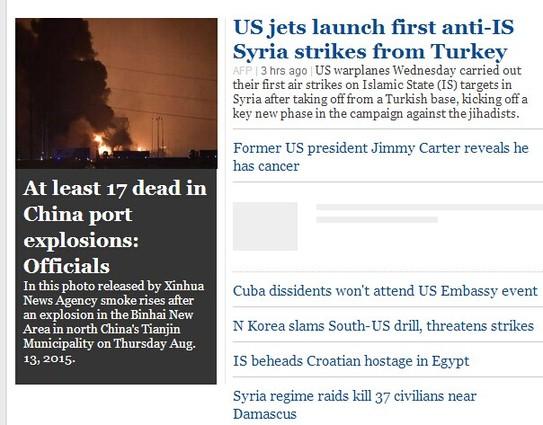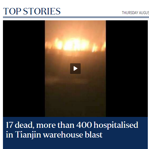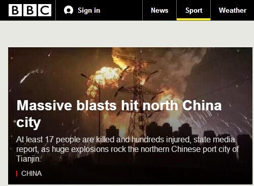 世界主流媒体头条聚焦天津爆炸:17死多人受伤(组图)