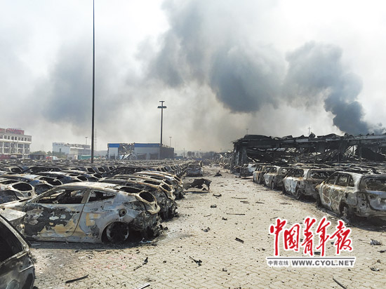 事故现场附近的一个汽车仓储场里,1000辆左右的汽车被烧毁。本报记者 李超/摄