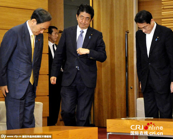当地时间2015年8月14日,日本东京,日本首相安倍晋三在首相官邸召开临时内阁会议。据报道,会议通过了安倍的战后70周年谈话。谈话中包括继承历代政权的基本立场,(日本)作为和平国家积极为国际社会做贡献等。安倍将会在稍后的记者会上发表谈话。 图片来源:JIJI PRESS/CFP