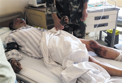 上午8时许,周倜被送往泰达医院接受治疗。躺在病床上,周倜四肢有被烧黑的痕迹,隐约发出“疼,疼”的声音,体质较为虚弱。