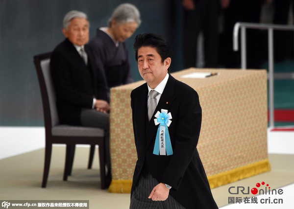 当地时间2015年8月15日,“全国战殁者追悼仪式” 在日本东京武道馆举行。 当日是日本宣布无条件投降70周年纪念日,日本政府在日本东京武道馆举行“全国战殁者追悼仪式”。日本首相安倍晋三与天皇夫妇出席仪式。图片来源:TORU YAMANAKA/CFP