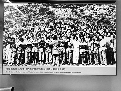 抗战馆展览上的一张老照片,让参观者重温了冼星海和鲁艺人一起排练《黄河大合唱》的情景。这张照片拍摄于1939年5月,当时鲁艺百余位师生正为庆祝鲁艺成立一周年加紧排练,冼星海作为作曲者,也跨界当起了指挥。照片中他站在山坡的平地上,身着军装和绑腿,踮着脚,倾着身子,挥动双臂,样子十分投入,百余号师生的目光都聚在他身上。