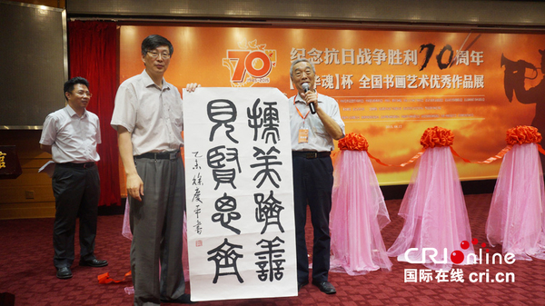 国际在线报道(记者 李琳):“纪念抗战胜利七十周年——中华魂杯全国书画艺术优秀作品展”17日在北京台湾会馆举行。本次画展由中国书画家联谊会、中国军事文化研究会、北京市台湾同胞联谊会联合主办。