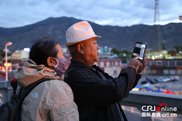 一对六旬老人在观景台上举起手机拍摄布达拉宫的景色,也实现了他们有生之年到西藏看看的愿望。摄影:张攀