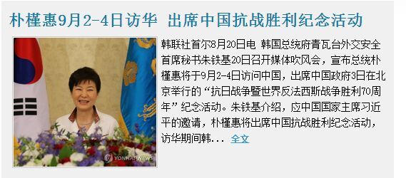 朴槿惠将于9月2-4日访问中国,出席中国政府3日在北京举行的“抗日战争暨世界反法西斯战争胜利70周年”纪念活动。