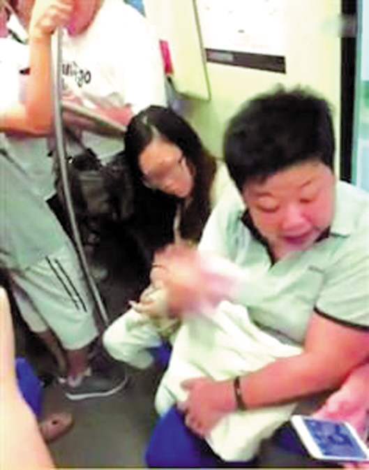 前天,一段1分28秒的视频在网上热传。视频显示,在地铁车厢内,一名手缠绷带的女乘客拼命顶靠座位末端,向身旁穿粉色衣服的小姑娘挤去,甚至动手打人,而在“粉衣女”另一边坐着的胖阿姨挺身而出,为其打抱不平,甚至让“粉衣女”与其互换座位,希望用自己的身体去保护“粉衣女”不被“绷带女”打骂(见图)。有网友指出,这是发生在8月19日上海8号线地铁车厢的一幕。