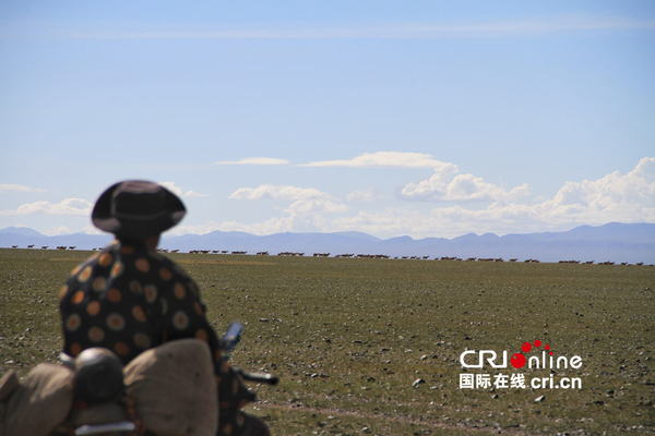 藏地精灵之藏羚羊,一名藏族野保员正在远处观察藏羚羊们的动向 摄影 廖继勇