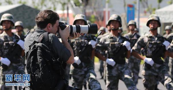 8月22日,外国媒体记者在阅兵训练基地拍摄参训官兵训练。 9月3日胜利日大阅兵临近。8月22日,50余家中外媒体的90多名记者走进阅兵训练基地采访。 新华社记者 殷刚 摄