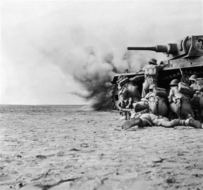 1942年,阿拉曼,英军步兵在坦克的掩护下行进。