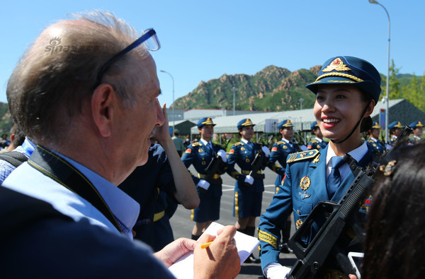 外国记者进阅兵训练基地采访参训美丽女仪仗兵