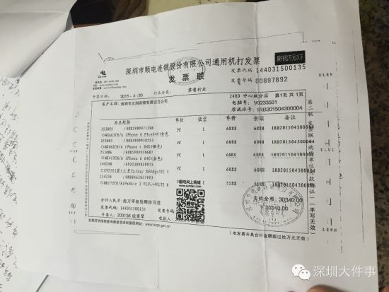 举报人在举报信中还称,酒店负责人不但喝茅台,还经常带走库存茅台酒。在举报人提供的证据当中,大大君还发现一张发票复印件显示,五洲宾馆在今年4月30日在顺电购买了4部手机以及一台苹果电脑,其中4部手机均为苹果、三星新款手机,总价3万多元。