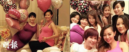 中新网8月25日电 据香港“明报”即时消息,汤盈盈和钟丽淇同时怀有二胎,为庆祝两人腹中都怀着小宝宝,佘诗曼、周家蔚等为两人举办派对。今日,汤盈盈还在微博分享照片,照片中,她与钟丽淇均挺着巨肚,同时,她还晒出自己的露肚照。