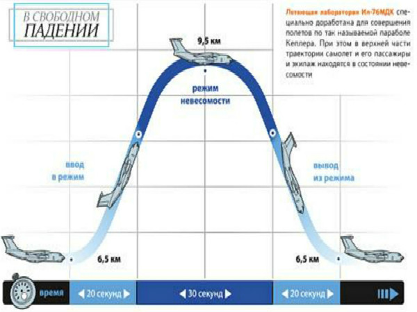 新华国际客户端了解到,伊尔-76失重飞机由伊尔-76运输机改装而成,能容纳20人同时进行训练。舱内两边装有把杆,地上铺有厚厚的软垫。为防万一,飞机上备有降落伞。伊尔-76的一个起落可飞15至20个抛物线,每个抛物线可产生25至28秒的失重时间。由于失重飞机做抛物线飞行时,是失重和超重交替进行的,即使对航天员来说,那也是一种不小的考验。