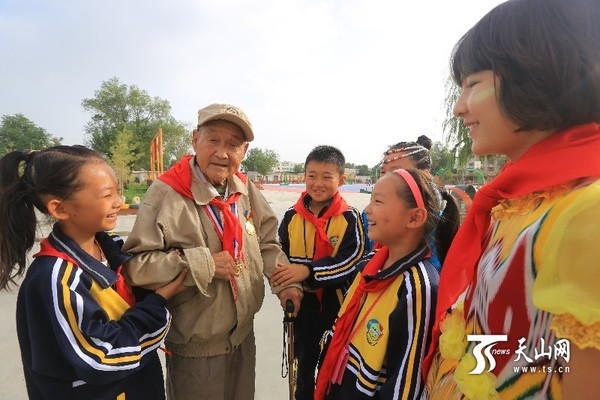 天山网讯(通讯员年磊 何阳摄影报道)“我当过缅甸远征军,参加日军受降仪式,能投身抗战是我毕生引以为荣的事,参军报国最光荣。”8月27日,在新疆博湖县第一小学操场上,95岁的中国远征军老兵牛维刚正在向小学生讲述着他的抗战故事。当日,为纪念中国抗日战争胜利70周年,新疆博湖组织开展“听抗日老兵讲故事‘红色教育’进校园”活动。