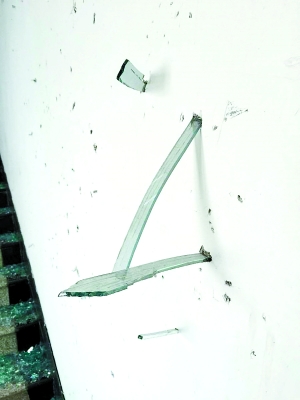 天津滨海新区爆炸事故中,爆炸产生的冲击波震碎窗户,玻璃碎片直插入水泥墙体。