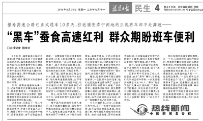 本报讯 (记者 程枝文 通讯员 吴庆堂 吴苏梅)8月24日本报民生版刊发《“黑车”蚕食高速红利 群众期盼班车便利》一文(下图为当天版面图),报道了福寿高速公路已正式通车10多天,往返福安寿宁两地的正规班车却不走高速,由此给了两地“黑车”市场巨大的生存空间。