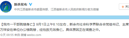人民网北京9月1日电 据江西省新余市人民政府新闻办官方微博消息,今日上午8:10左右,江西省新余市社会科学界联合会党组书记、主席万祥安在单位办公楼跳楼,经抢救无效身亡。