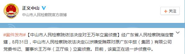 经广东省人民检察院指定管辖,8月31日,中山市人民检察院依法决定以涉嫌受贿罪对原广东中旅(集团)有限公司党委书记、董事长王万年(正厅级)立案侦查。目前,该案正在进一步侦查中。