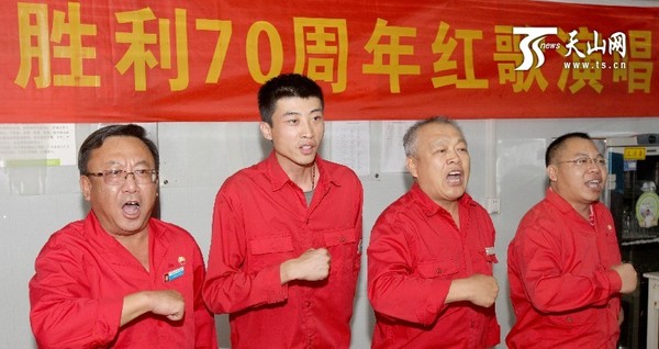 天山网讯(通讯员周建玲摄影报道)9月1日,奋战在古尔班通古特沙漠腹地的新疆油田公司监理公司腹部项目部举行“唱红歌”演唱会,来自项目部的6支代表队,分别演唱了《歌唱祖国》、《南泥湾》、《中国人民解放军军歌》、《义勇军进行曲》和《大刀进行曲》等经典歌曲,用石油工人的歌声纪念中国人民抗日战争暨世界反法西斯战争胜利七十周年。