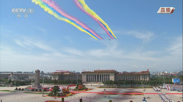 国际在线直播报道:上午11点25分起,随着8架战鹰拉出8道彩烟,我国阅兵史上规模最为庞大的空中梯队临空接受检阅。胜利日阅兵空中梯队共有18型近200架飞机参阅,规模和机型数量创历史之最。空中梯队历次受阅编队队形包括楔形、三角形、菱形、九机编队、大小飞机编队等,这次阅兵在传统基础上又有新变化,如首次采取纪念字样的编队飞行、直升机梯队首次采用大机群密集编队飞行、歼击机梯队首次以全新队形参阅等。