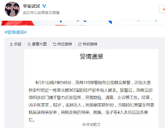 人民网北京9月5日电 据武汉市公安局官方微博@平安武汉通报,8月31日晚19时40分,武汉汉阳大道钟家村附近一栋单元楼302室的住户家中有人被杀害。经查,凶手张某某,52岁,武昌区人,因婚姻家庭纠纷,当晚持匕首窜至前期杨某某母亲家中,将杨及杨的母亲、弟媳、侄子等4人杀死后自杀身亡。