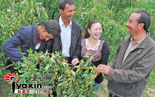 9月1日,尤良英(右二)在自家的红枣地里为麦麦提图如普·穆萨克(右三)等人讲解红枣管理技术。亚心网记者 约提克尔·尼加提摄