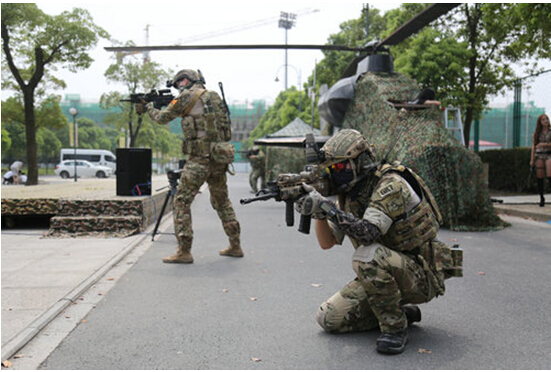 随后,现场开启的活动则让学生们恍然大悟——原来这是该校纪念抗战的校园版阅兵开学礼。有现场目击者称,阅兵式正式开启时,有荷枪实弹的大兵从机舱内鱼贯跳出,然后迅速进行了侦察演练的表演,威慑力十足,其后运送神秘军事物品的情景演出,也引爆全场。