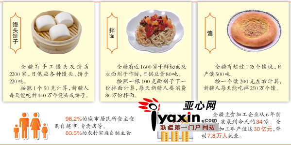 亚心网讯(首席记者于江艳)新疆人爱吃面食,一天到底要吃掉多少馒头、拌面和馕呢?新疆农业产业化发展局和新疆农业科学院粮食作物研究所日前完成的一份专题调研报告显示,全疆手工馒头及饼店有2200家,日供应各种馒头、饼子220吨。按照一个50克重计算,新疆人每天能吃掉440万个馒头或饼子。