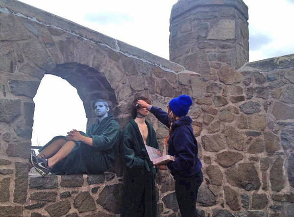 弗莱彻正在为2名模特上妆,右侧蓝脸模特融入砖石建筑中。