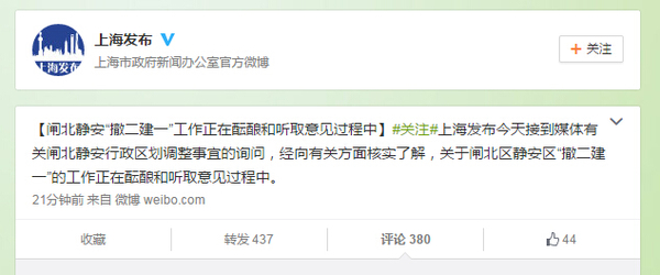 原标题:上海市新闻办:闸北静安两区合并工作正在酝酿