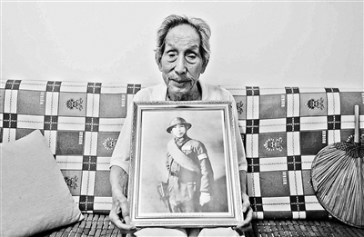 于文瑞抱着一幅照片坐在沙发上,关爱老兵协会的志愿者正在他对面支起三脚架为他拍摄照片。装在金色相框中的照片几乎完全挡住了他的上半身,只露出脑袋。照片中的他29岁,一身戎装,头戴钢盔,腰间别着手枪,身体微侧,神情恰似抗战老片中那些英勇奋战、意气风发的英雄角色。