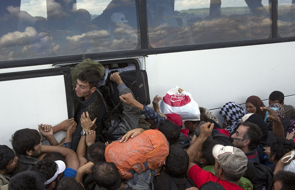 移民们试图挤上大巴车(网页截图)
