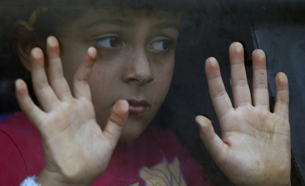 一位儿童透过大巴车的窗户向外看(网页截图)