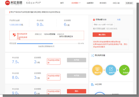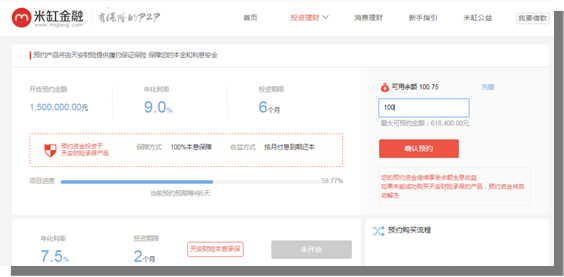 近日,有保险的P2P平台——米缸金融上线推出产品“预约购买”功能,投资者可通过“预约购买”率先预定米缸定期理财产品。预约成功后,预约资金将被冻结,一旦产品上线即自动成交;且所预约产品将由天安财险提供履约保证保险,保障本金和利息安全。
