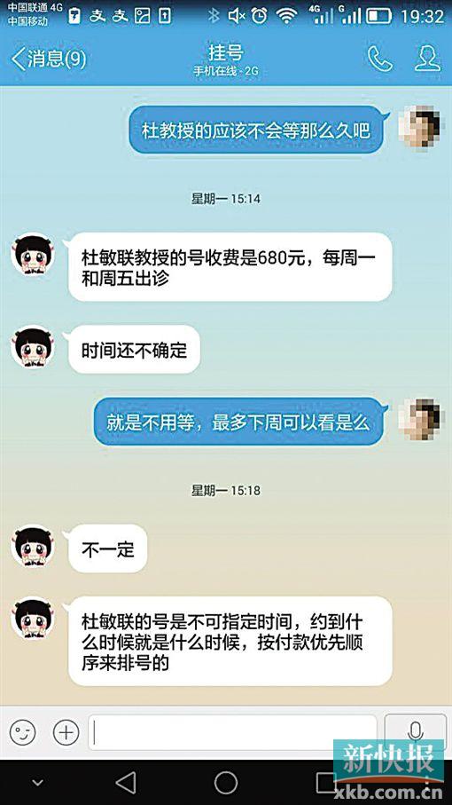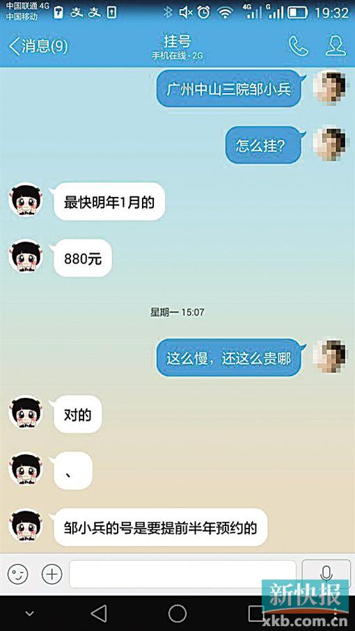 记者点击进入这家代人挂号的网站,左侧就跳出“挂号客服部”的对话框,20多名客服人员的头像不断忽闪。通过网页上的QQ客服联系了其中一名李先生,李先生告诉记者,广州三甲医院所有专家的号他们都能挂。记者要求挂中山一院儿科杜敏联教授的号,李先生一口答应,并称首先要成为广州挂号网的会员,交年费260元,同时杜教授的号每个680元;而自闭症专家邹小兵教授的号,李先生说排队的人太多,880元一个号,明年1月前能够看上,如果要提前看,必须加钱,如果指定看病时间,1500元-3000元。记者大呼贵时,客服回复称,安排床位费更贵,例如中山一院、省人民医院等广州市内大医院肿瘤、血液、生殖科等床位也能帮忙预约,5000元起步。