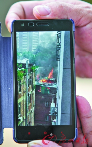 目击市民用手机拍下火光冲天的照片。 广州日报记者苏俊杰摄
