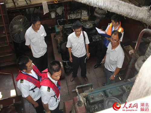 上午8时,富池海事处执法人员驱艇前往盘塘汽渡口,与在那里等候的船检人员碰头。随后,分成两个小组,对拖轮“武穴318”和渡驳“鄂阳新渡9号”同时进行检查。