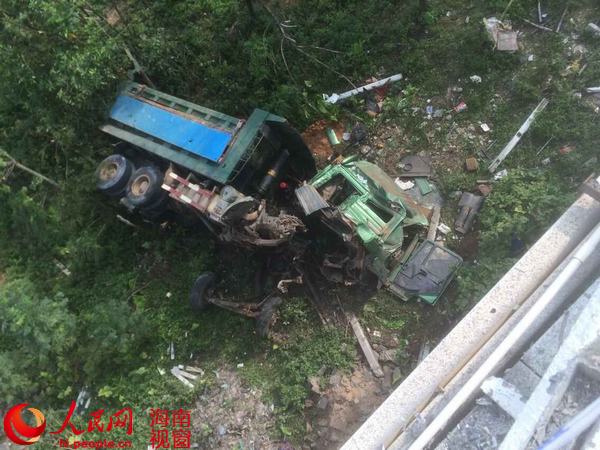 9月10日上午,海口市琼州大桥上发生一起车祸,一辆拉土的大货车在撞倒一辆电动车后冲出护栏,掉落到桥下的南渡江边,车辆受损严重,事故造成包括货车司机在内2人受伤。