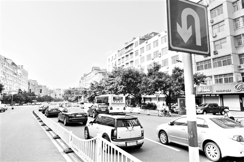 昨日上午记者来到该路口发现,三条直行车道空空如也的时候,左转及调头道却排着长龙。不少左转车主受不了长时间等待调头车辆,只能开到直行车道上等候,很容易造成交通混乱。