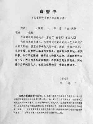 记者看到了杨律师提供的誓词样本,上写:“我作为本案的当事人,所作陈述可能会对他人及其家庭产生重大影响,甚至会影响他人的一生,因此,我面对法庭,郑重宣誓:以我的人格及良知担保,对法庭如实陈述,据实回答,如作不实陈述,违背良心和做人良知,灵魂深处将日夜不安,内心饱受折磨和煎熬,不但要受到法律制裁,同时将作为不诚信之人,被贴上耻辱标签,受到道德谴责。”