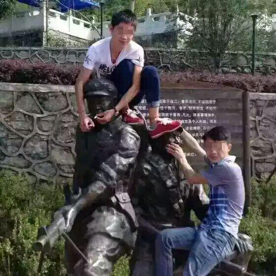 重庆两青年踩红军雕像并往头嘴里塞烟 已被训诫并道歉